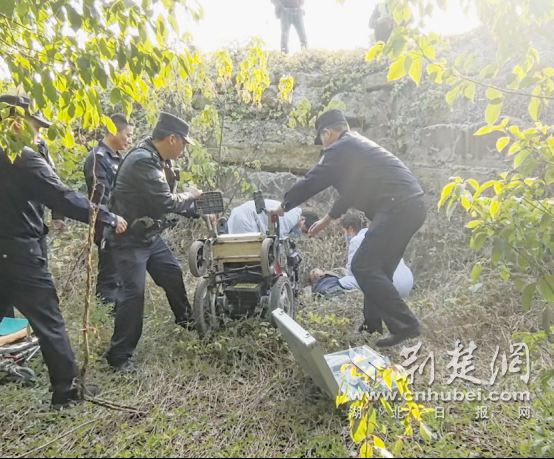 12月5日下午3点左右,十里铺派出所接到热心群众求助,热心人士称,十里铺镇聚湾水库附近,一名残疾老人乘坐的电动轮椅突然失控,人和车辆掉入路边山沟。辅警赶到现场,发现运河深约5米。老人头部受伤,电动轮椅侧滚,但仍神智清醒。民警立即上前安慰老人,询问其伤情,并拨打120急救电话尽快通知儿子,并设法通知他的家人。
