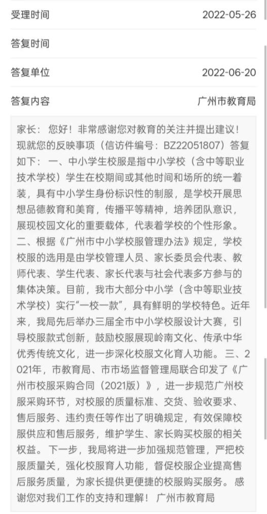 针对舆论热议,广州市教育局12月10日回应称,尚不知晓广州市统一校服问题,并将相关信息转相关部门。虽然这个回应并没有虽未表达明确立场,但基于此前的官方立场,可以看出明确的方向——2022年,市教育局在回复家长相关建议时明确指出,中小学校服是“体现校园文化的重要载体”,代表学校个性形象。根据《广州市中小学校服管理办法》,校服的选择需要学校、家长、学生等集体决定。目前,广州大部分中小学实行“伊桑学校、示范校”,具有独特的学校特色。